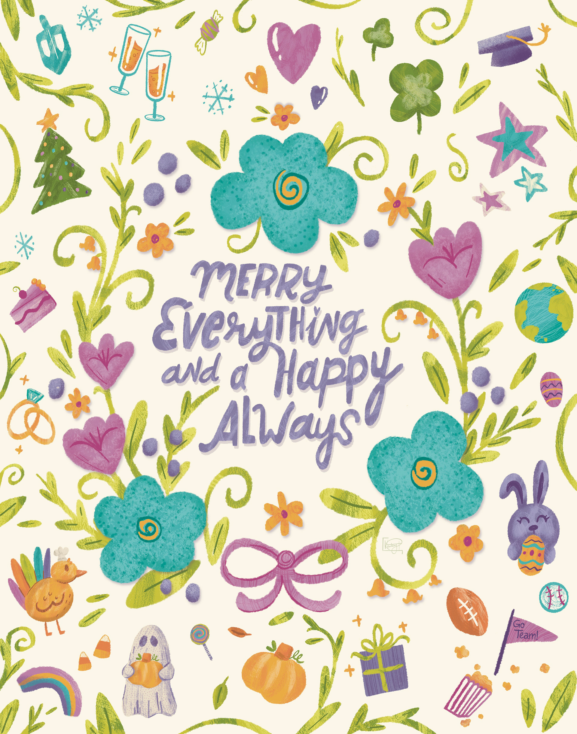 Merry Everything & a Happy Always Wreath, 12x12", Digital Illustration with Hand Lettering